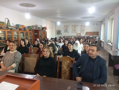 7 MART 2024 – ci il tarixdə Gəncə Dövlət Universitetinin Fizika və texniki fənlər fakültəsinin ÜTF və texnologiya kafedrasının b/müəllimi Tağıyeva Saidə Abduləli qızının III kurs Texnologiya müəllimliyi ixtisasında “Metal məmulatlarının hazırlanması texnologiyası”fənnindən “Təbəqə metalın emal edilməsi” mövzusunda açıq dərsi keçirilmişdir.