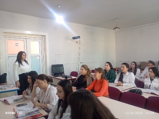 12 Mart 2025-ci il tarixində Xarici dillər fakültəsinin “Praktik Xarici dillər” kafedrasının müəllimi Salahova Yeganə Həsən qızının “Təsviri incəsənət müəllimliyi” ixtisası üzrə I kurs tələbələri ilə “Xarici dildə Akademik kommunikasıya” fənnindən “Speakout unit3.2 Real friends” mövzusunda açıq dərs keçirildi.