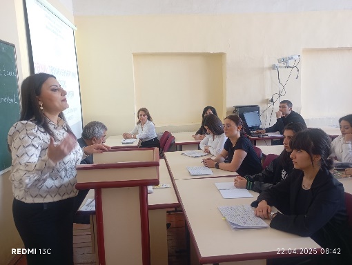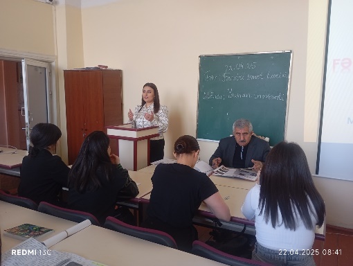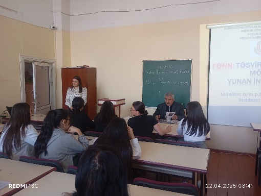 22 aprel 2025-ci il tarixdə “Təsviri incəsənət” kafedrasının pedaqogika üzrə fəlsəfə doktoru, b/m. Cahangirova Lalə Vladimir qızının “Təsviri incəsənət müəllimliyi” ixtisası üzrə I kurs tələbələri ilə “Təsviri sənət tarixi” fənnindən “Yunan incəsənəti” mövzusunda açıq dərsi keçirildi.