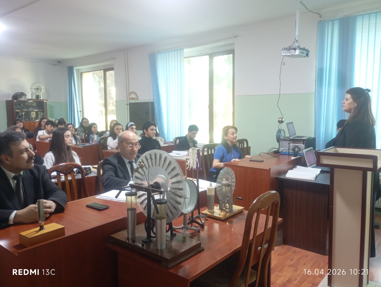 16 aprel 2026-cı il tarixində Fizika kafedrasının baş müəllimi Mövsümova İlhamə Möhkəm qızının I kurs “Fizika müəllimliyi” ixtisasında “Fizikadan əsas anlayışlar və onların tədrisi ” fənnindən “Elektrik sahəsi, potensial gərginlik anlayışlarının elmi – metodik təhlili, formalaşdırılması və tədrisi metodikası” mövzusunda açıq dərsi keçirildi.